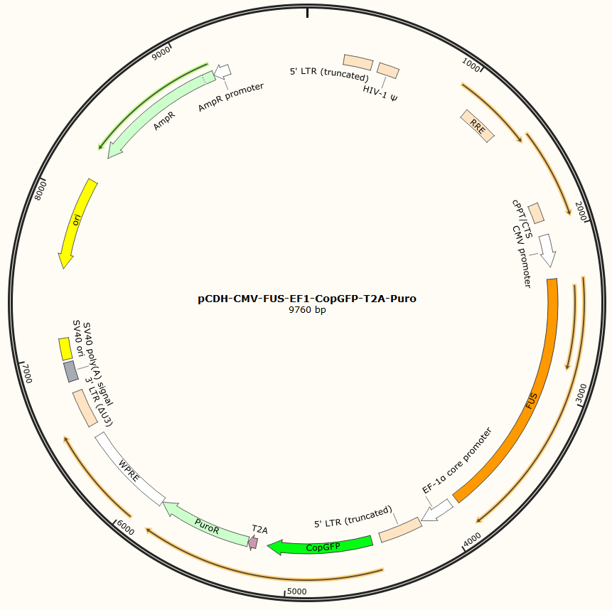 pCDH-CMV-FUS-EF1-CopGFP-T2A-Puro是以基恩科生物自研慢病毒骨架载体Lenti-SFFV-MCS-EF1-CopGFP-T2A-Puro为骨架载体构建,过表达人FUS基因,与载体PMD2.G和Pspax2配套进行慢病毒包装。
