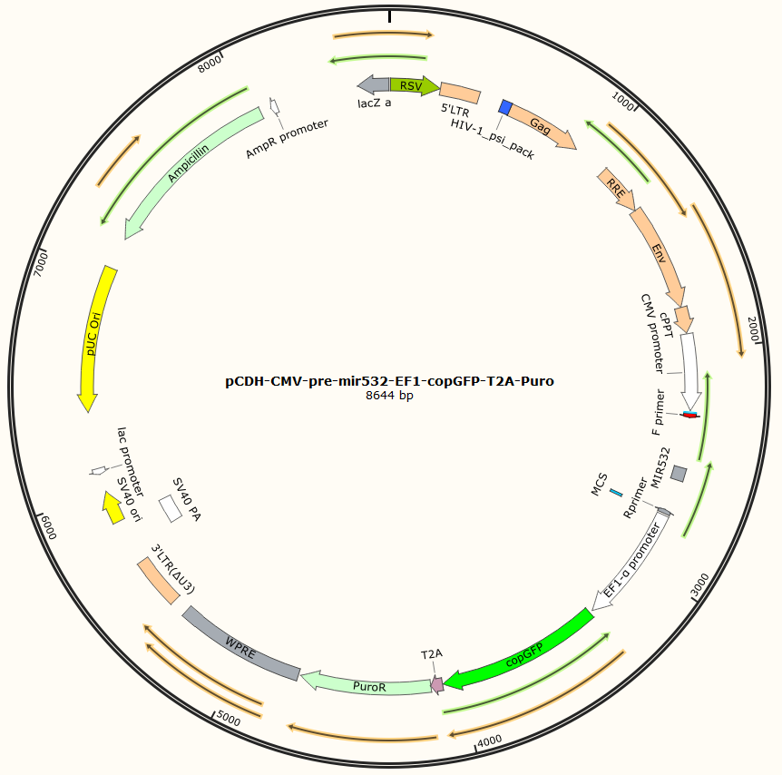 pCDH-CMV-pre-mir532-EF1-copGFP-T2A-Puro是以基恩科生物自研慢病毒骨架载体pCDH-CMV-MCS-EF1-copGFP-T2A-Puro为骨架载体构建,过表达人hsa-mir-532基因,与载体PMD2.G和Pspax2配套进行慢病毒包装。