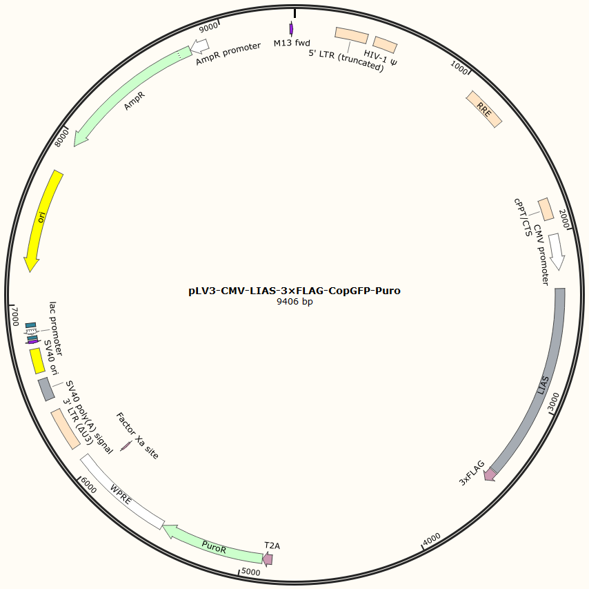 pLV3-CMV-LIAS-3×FLAG-CopGFP-Puro是以基恩科生物自研慢病毒骨架载体pLV3-CMV-MCS-3×FLAG-CopGFP-Puro为骨架载体构建,过表达人LIAS基因,与载体PMD2.G和Pspax2配套进行慢病毒包装。