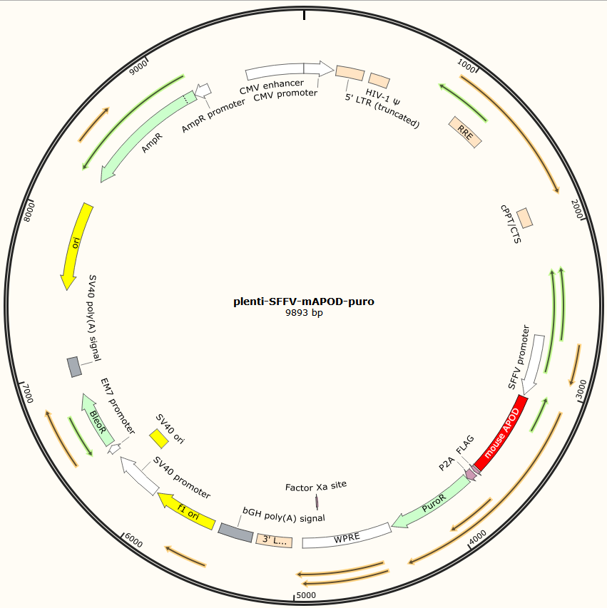 plenti-SFFV-mAPOD-puro是以基恩科生物自研慢病毒骨架载体plenti-SFFV-MCS-Puro为骨架载体构建,过表达小鼠APOD基因,与载体PMD2.G和Pspax2配套进行慢病毒包装。