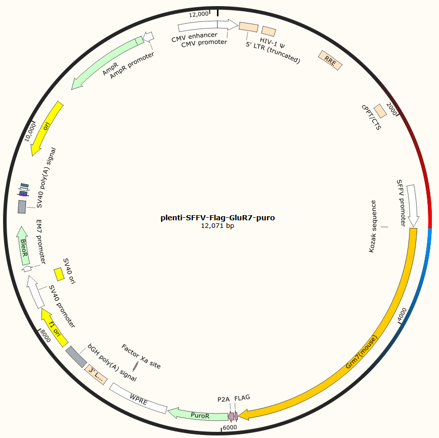 plenti-SFFV-Flag-GluR7-puro是以基恩科生物自研慢病毒骨架载体Lenti-SFFV-MCS-Puro为骨架载体构建,过表达小鼠GluR7基因,与载体PMD2.G和Pspax2配套进行慢病毒包装。