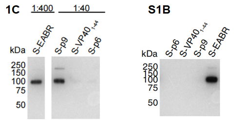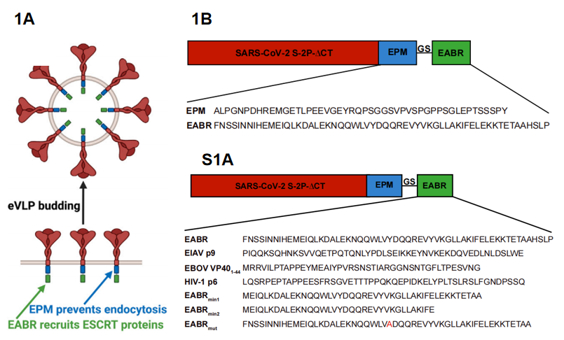 研究人员用编码 S-EABR,S-p9,S-VP401-44 以及 S-p6 的质粒转染 Ex-pi293F 细胞,20%蔗糖缓冲液超速离心,收集上清液,测定上清液中产生 eVLP 的数量。Western blot分析显示,在S-EABR构建体中检测到最高的S蛋白水平,这表明CEP55 EABR诱导了含S的evlp的有效自组装(图1C和S1B)。S- eabr构建体稀释为1:400时,与S-p9构建体在1:40稀释时产生了相似的强烈条带,表明来自 CEP55 的 EABR 高效触发 S 蛋白自组装成 eVLPs,要比 S-p9 蛋白组装的 eVLPs 高出 10 倍。CEP55 EABR能结合ALIX和TSG101 17,而EIAV p9只结合ALIX,23这表明有效的eVLP组装需要两种ESCRT蛋白的最佳募集。S-p6和S- vp401 - 44样品含有很少或没有S蛋白,这表明eVLP的组装效率低,可能是由于对ESCRT蛋白的亲和力较低(图1C和S1B)。