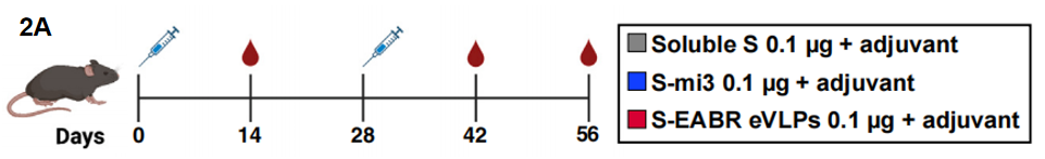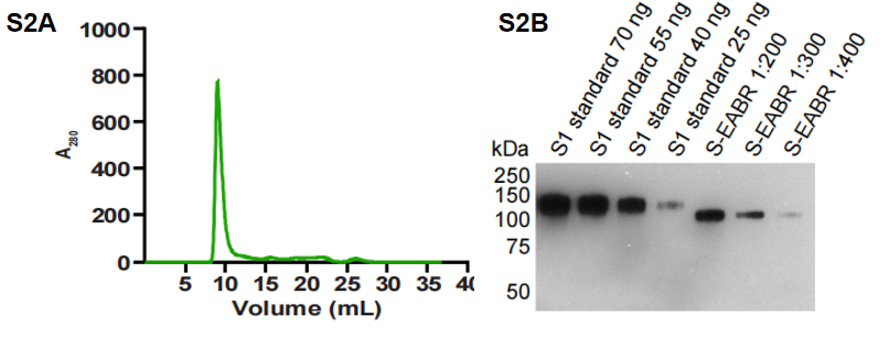 在C57BL/6小鼠中评估了纯化的S-EABR eVLP作为针对SARS-CoV-2的候选疫苗的潜力(图2A)。通过在20%蔗糖缓冲液上超速离心,然后进行尺寸排阻色谱(SEC),从转染的细胞上清液中纯化S-EABR eVLP,并通过定量Western blot分析测定S蛋白浓度(图S2A和S2B)。将S-EABR eVLP的免疫与纯化的可溶性S和共价连接到SpyCatcher-mi3蛋白质纳米颗粒(S-mi3)上的可溶性S进行比较。在Sigma佐剂存在的情况下,在第0天和第28天通过皮下注射对所有免疫原给予0.1 ug剂量(基于S蛋白含量计算)(图2A),研究人员通过酶联免疫吸附试验(ELISA)和体外假病毒中和试验评估血清抗体反应。