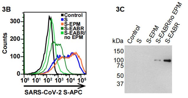 研究人员测试了无EPM的S-EABR构造体的eVLP产生。Western blot分析显示表明,与无EPM的S-EABR相比,S-EABR转染的细胞中检测到eVLP纯化后S蛋白的量明显多,而去除掉 EPM 序列,eVLP 产生量显著减少。表明EPM增强了eVLP的产生(图1F)。