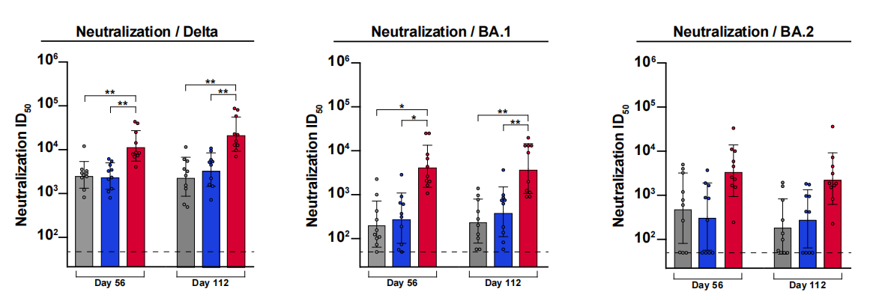 S-EABR mRNALNP的几何平均中和滴度分别比纯化的S-EABR eVLP和S mRNA LNP引发的滴度高5.1倍和5倍(图4C和4D)。增强后3个月(第112天),与纯化的S-EABR eVLP和S mRNA LNP相比,S-EABR mRNA LNP的平均中和滴度分别高5.9倍和6.8倍,表明血清中和活性的增加是持续性的。