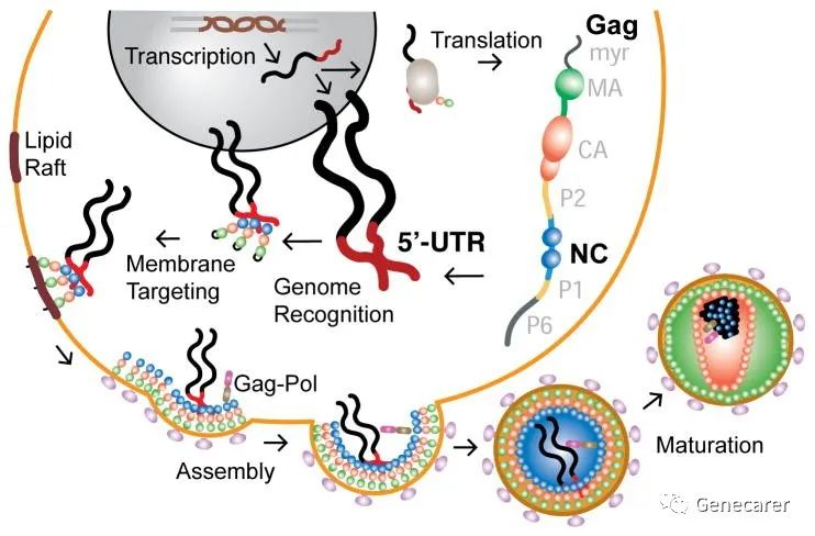 Gag的MA结构域在细胞内转运和膜靶向性中起着重要作用。Gag的HIV-1 MA结构域中的两个基本残基突变可导致Gag和病毒基因组在细胞核中积累。这些突变还导致病毒颗粒的产生显著减少,形成的颗粒传染性差,似乎主要含有单体基因组。早期的研究表明,Gag的MA结构域包含一个核定位信号(NLS),这些发现表明MA也具有一个核输出信号(NES),并且这两个信号在Gag在病毒组装前短暂穿梭穿过细胞核中都起作用。但是这些发现没有在其他实验室得到重复,gag为什么需要入核后再出核仍然是科学问题。