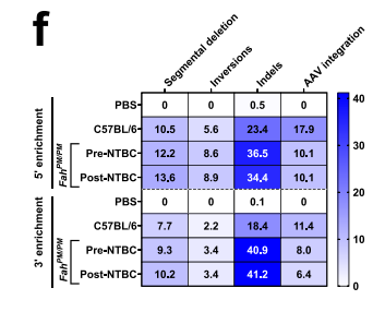 在C57BL/6小鼠中,为了不表现出编辑细胞的选择性增殖,用双sgRNA处理:设计1或4在两个靶位点之间分别产生50.5±8.7%和33.6±6%的节段缺失;在NTBC退出前分析的小鼠表现出33.3%(设计1)和15.8%(设计4)的节段缺失效率。NTBC停药和选择性肝细胞扩增三周后,载体设计1和4分别产生35.7±3.3%和33.2±4%的节段缺失。