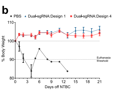 编码肝酶富马酸乙酰乙酸水解酶(Fah)的Fah基因通过在外显子5(Fahneo/neo)中插入新霉素表达盒而被破坏。这种疾病在小鼠中的一个标志是,当小鼠不在补充有药物2-(2-硝基-4-三氟甲基苯甲酰基)-1,3-环己烷二酮(NTBC)的水中维持时,体重会逐渐减轻,NTBC阻断FAH上游的酪氨酸分解代谢途径,防止因FAH损失而导致的肝毒性代谢产物的积累。在NTBC退出前对每组中的一只小鼠以及C57BL/6小鼠进行了编辑评估,在NTBC退出后,Fahneo/neo小鼠被有效地从HT-I的致死表型中拯救出来,3周体重稳定;相反,注射PBS的Fahneo/neo小鼠在NTBC停药后4-13天内体重减轻了10%以上,并被安乐死。在NTBC退出前对每组中的一只小鼠以及C57BL/6小鼠进行了编辑评估,在NTBC退出后,Fahneo/neo小鼠被有效地从HT-I的致死表型中拯救出来,3周体重稳定;相反,注射PBS的Fahneo/neo小鼠在NTBC停药后4-13天内体重减轻了10%以上,并被安乐死。