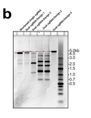 基于纳米孔的实时测序平台,测序数据显示,与主要包含从ITR到ITR的全长基因组的双sgRNA:Design 4载体不同,双sgRNA:Design 1产生了高频率的截短基因组。这些截断主要集中在两个位置,第一个定位在sgRNA表达盒上,产生只携带单个sgRNA的载体;第二个位于h Nme2 Cas9转基因的3′端。